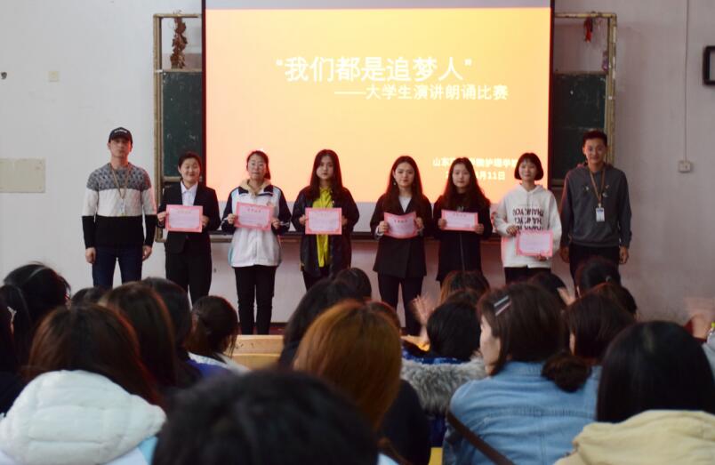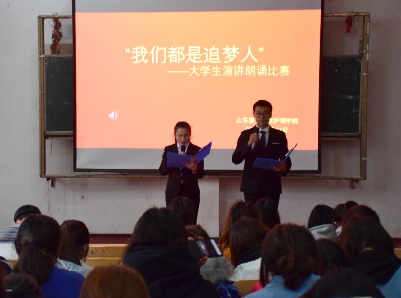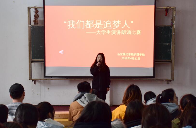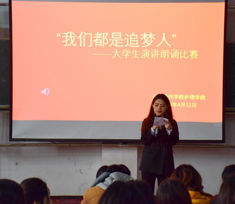 为进一步丰富学生校园文化生活,激发广大学生做新时代奋斗者的热情,2019年4月11日,由山东现代学院护理学院举办的“我们都是追梦人”主题演讲比赛在阶梯教室108隆重举行,护理学院学生会干部担任了本次比赛的评委,共有10位在初赛中成绩优异的选手参加决赛。