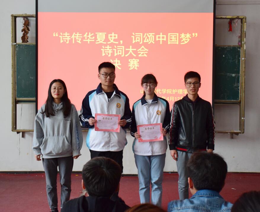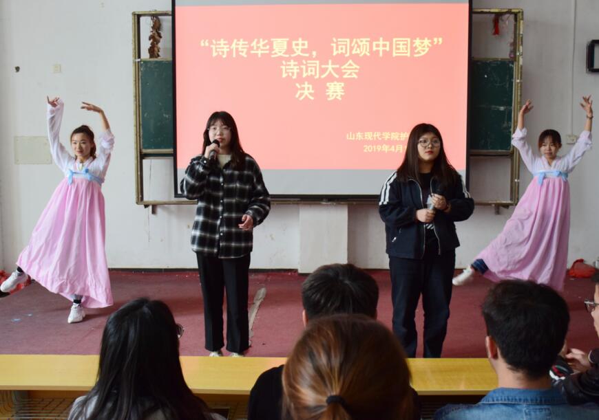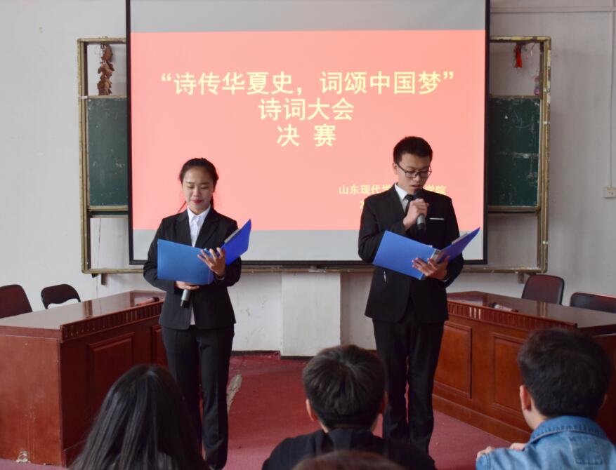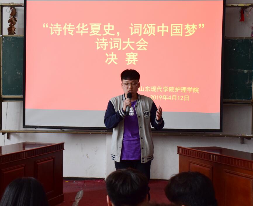 为打造书香校园,搭建学生之间交流学习的平台,感受诗词魅力,传承中华传统文化。 2019年4月12日,由山东现代学院护理学院主办的的“诗传华夏史,词颂中国梦”诗词大会决赛在合堂108成功举行。本次诗词大会决赛共有4个班级参加,护理学院学生副书记白瑞强以及学生会各部门干部担任本次比赛的评委,现场共150余名学生共同观看了比赛。
