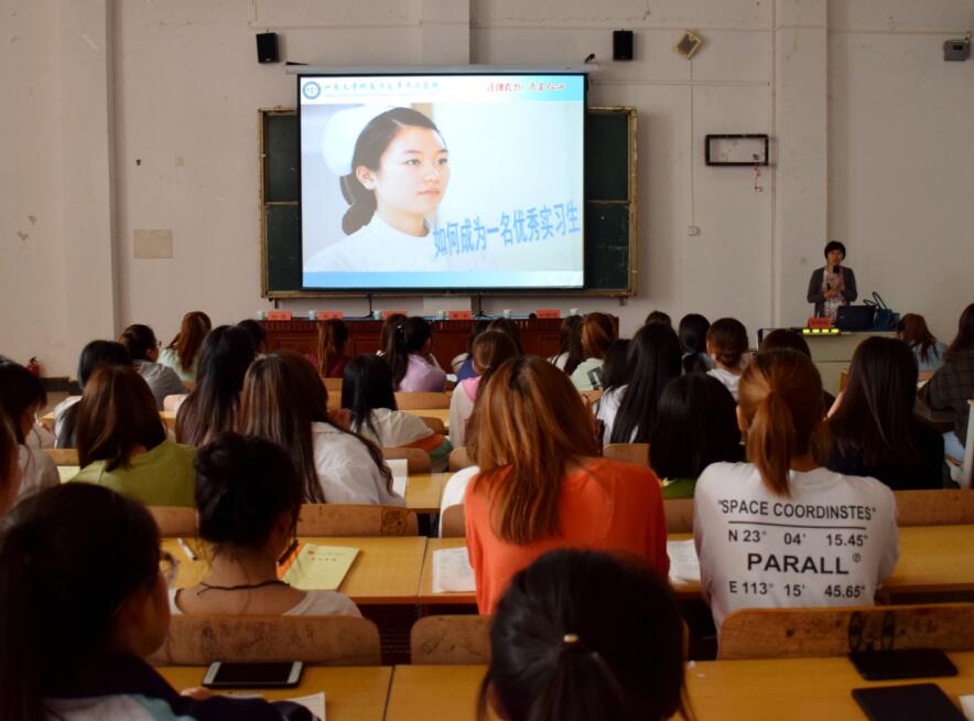 为加强对我院实习生的专业指导,促进我院学生的实习和就业。2019年5月14日,山东现代学院护理学院特邀山东大学附属济南市中心医院教研室主任周华主任在合堂108为2019届护理实习生开展了一场题为“如何成为一名优秀的实习生”的讲座,并在讲座结束后对实习生进行了面试。山东现代学院就业办华霞主任,护理学院李秀芳院长、刘锦绣院长,护理学院教管科刘丽丽主任以及护理学院就业办刘通主任参与本次讲座以及实习生面试。
