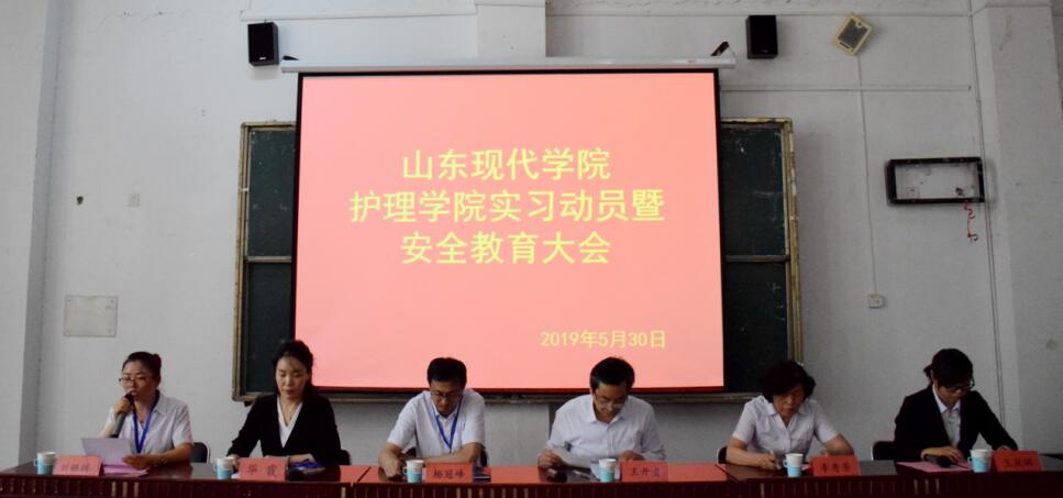 为保证2019届实习工作的顺利开展,保障学生在实习期间的安全。2019年5月30日,山东现代学院护理学院在合堂108开展了“实习动员暨安全教育大会”,山东现代学院王开贞院长,学生处杨冠峰处长,就业办华霞主任,学生处杨冠峰处长,护理学院李秀芳院长、刘锦绣院长出席会议,到会的还有护理学院全体实习生。会议由护理学院办公室主任王筱琳主任主持。