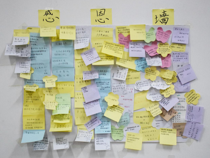最后,李佳炎老师带领同学们把最想对父母说的一句话贴在了感恩墙上,方式虽然古老,但表达的感情却是真心诚意。
