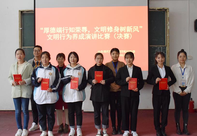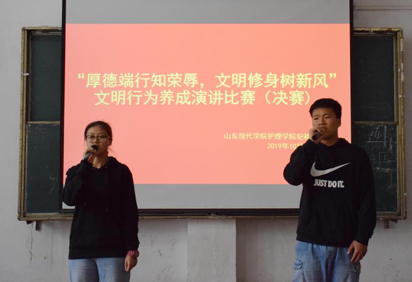在新中国成立七十周年之际,为弘扬社会主义核心价值观,鼓励同学们争做文明先锋,在校园内树立文明之风。山东现代学院护理学院特于2019年10月22日中午在合堂108举办“厚德端行知荣辱,文明修身树新风”文明行为养成演讲比赛决赛。本次活动由护理学院学生会纪检部主办,辅导员毕一鸣老师、焦倩老师、李佳炎老师、黄晓宇老师担任本次活动的评委。经过层层选拔,共有九名同学进入本次演讲比赛决赛。