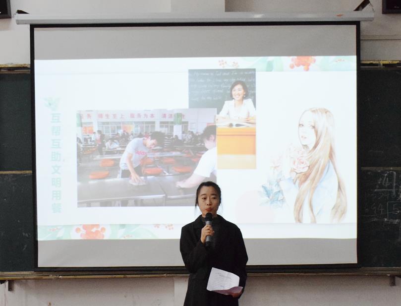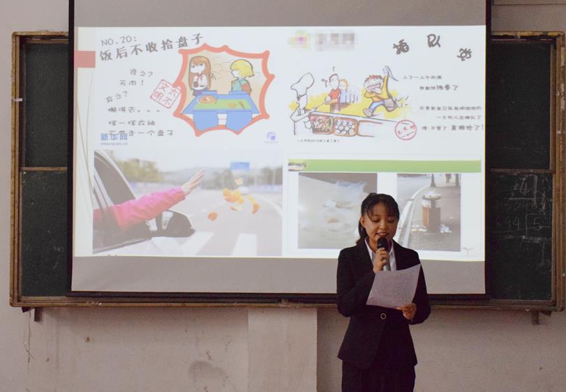 在主持人的介绍下,比赛正式拉开了帷幕。首先上场的是来自2019级本科护理学3班的孙悦同学。她讲到,同学们每播下一个动作,将收获一个习惯,播下一个习惯,将收获一个品格。只有将文明行为永记心中,才能真正做一个文明的学生。