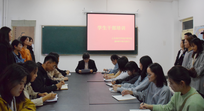 为提升学生干部的服务意识,提高学生干部的组织管理能力,促进学院工作更好的发展,促进同学和学院、同学和老师、同学和同学之间的沟通了解。2019年10月23日,山东现代学院护理学院再一教214举行了学生干部培训会议,办公室主任王筱琳主持本次会议,全体学生会干部参加本次会议。
