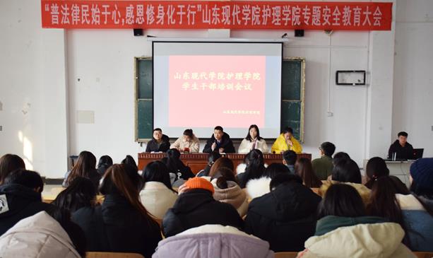 为提高同学们的安全防范意识,增强同学们在安全防范方面的能力,全面普及校园安全知识,山东现代学院护理学院于2019年12月6日下午1点在阶梯教室108召开班干部培训会议。本次会议由护理学院行政秘书赵继辛主持。