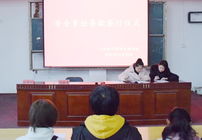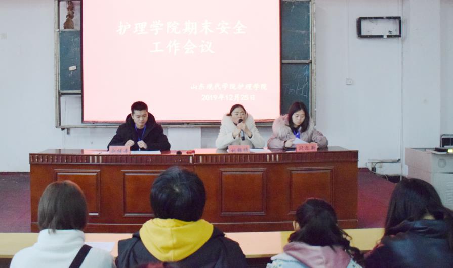 生命安全,重于泰山。临近期末考试,为确保同学们考试期间的人身安全,减少安全隐患,创建安全校园,山东现代学院护理学院于2019年12月25日在阶梯教室108召开护理学院期末安全工作会议。护理学院刘锦绣院长,行政秘书赵继辛老师、闫迎新老师及全体辅导员出席本次会议。