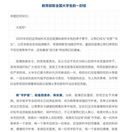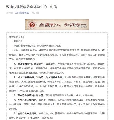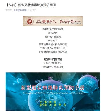 2020年农历新年伊始,新型冠状病毒肺炎感染的疫情在全国多地蔓延,形势严峻,疫情牵动着每一个人的心。为了配合国家的防疫工作和积极落实国家相关文件,防止病毒的进一步传播,提高学生对疫情的防控能力,增强学生的疫情防控意识,山东现代学院特推荐同学们观看《致山东现代学院全体学生的一封信》、《新型冠状病毒肺炎学习手册》、《教育部致全国大学生的一封信》及山东教育电视台“同心战疫”特别节目,并进行感悟分享。