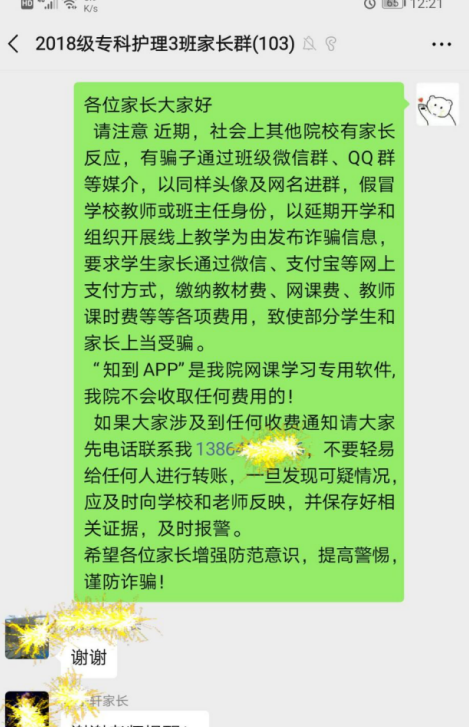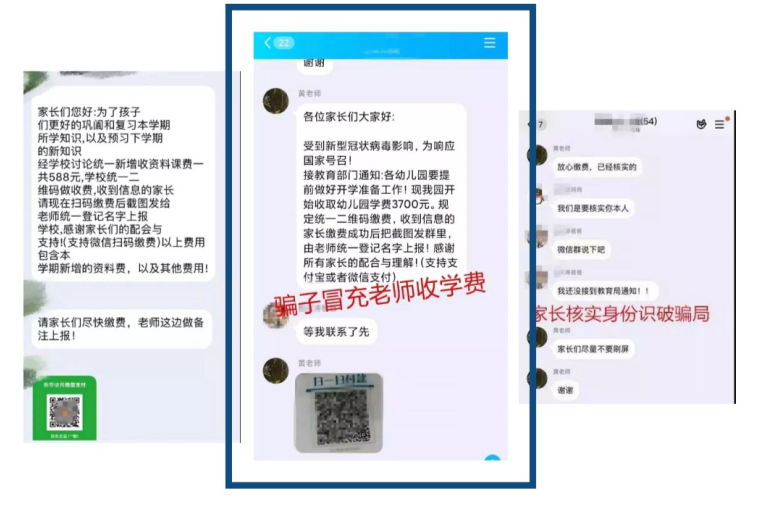 近期,一些家长反映,部分人以班级微信群、qq群等媒介,假冒学校教师,以延迟开学和组织开展线上教学为由发布诈骗信息,要求学生家长通过微信,支付宝等网上支付方式缴纳各项费用,致使部分家长上当受骗。