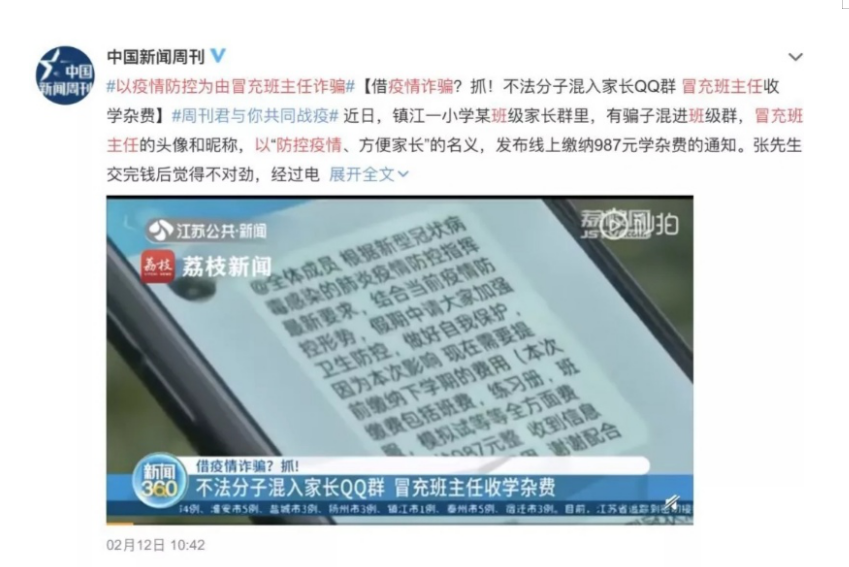 随着武汉地区爆发的新冠肺炎疫情不断扩大,为确保学生生命健康安全,各地纷纷延迟开学时间。为不耽误课程进度,疫情期间各学校“停课不停学”,微信群等社交媒体成为老师、家长、学生三方的沟通平台。然而,一些骗子乘机化身“假”老师,混进群内以收学费、书费为由实施诈骗,各种不断翻新诈骗方法随之而来,让人感到无比愤慨。