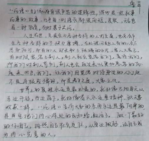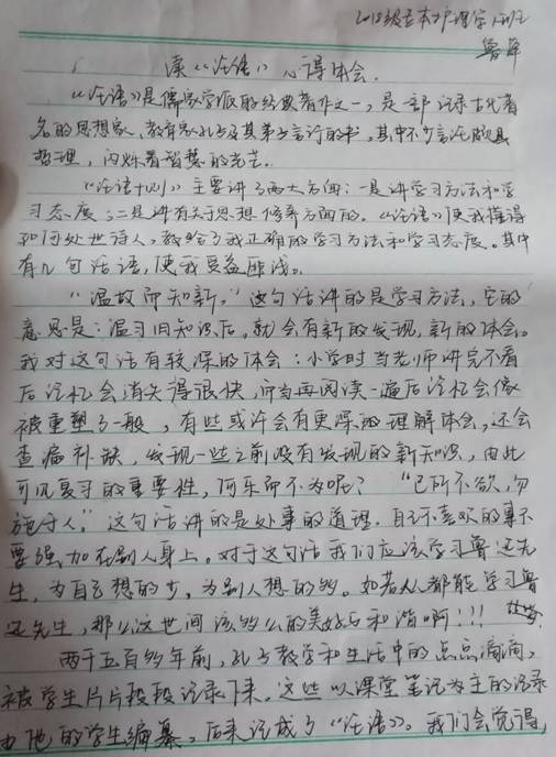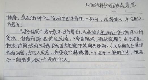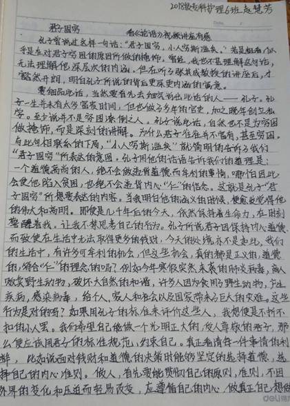 而2018级专科护理6班的赵慧芳同学在看完《论语》视频讲座则有了不一样的感悟。“君子国穷,小人穷斯滥矣。”做人,首先湖能贯彻自己的原则,准则,不用外界的变化和压迫而轻易改变,应遵值自己的内心,做自己真正想做的事情,真正的将“仁”化为自己身行的一部分。这样的人,亦可称之为君子!