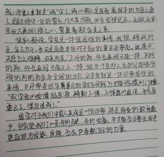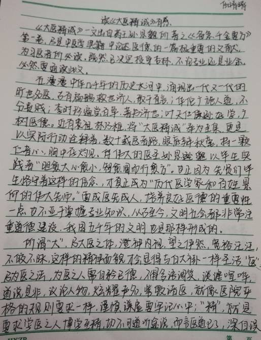 张湛日”天经方之难精,由来尚矣“"不同的病,外在表现可能一样,相同的病,外在表现可能又不一样,做为一个医护人员如何能够准确的判断病症并合理的治疗,这本身就是一件非常困难的事情、或许需要经年累月的学习与实践方才能够摸到门槛,“故学者必领博极医源,精勤不倦,不得道门途说,而言医道已了,深自误哉!”作为未来医护队伍中一员的2018级专本护理学1班的任晴晴同学在读完《大医精诚》之后有了这样的感悟。