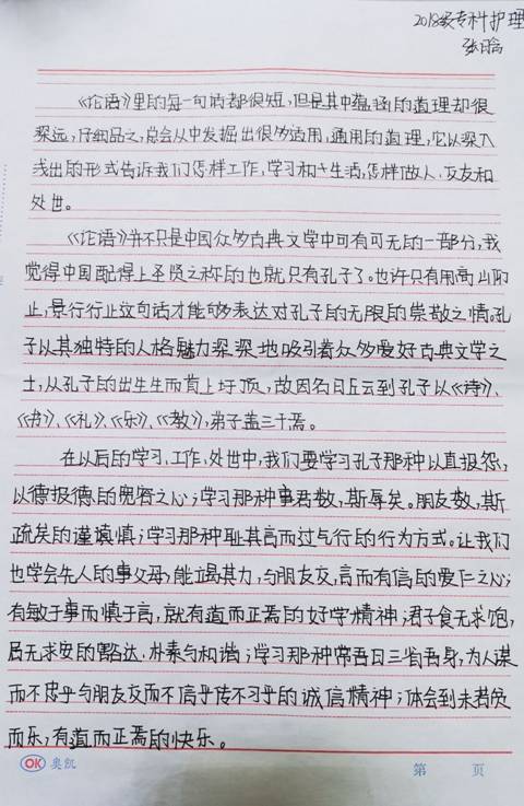 《论语》是中国春秋时期一部语录体散文集,是儒家学派的经典著作之一。2018级专科护理3班的张晗同学在阅读这部经典后就表示,《论语》并不是这个众多古典文学中可有可无的一部分。在以后的学习、工作、处世中,我们要学习孔子那种“以直报怨、以德报德”的宽容之心;学习到那种“事君数,斯辱矣。朋友数,斯疏矣”的谨慎……