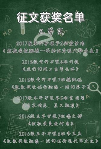 最终,2018级专科护理6班于秀芹同学荣获征文一等奖;2018级本科护理学3班张盼、2017级本科护理学1班邢瑞靖、2016级五年护理7班崔汶晓同学荣获二等奖;2017级本科护理学2班董梦洁、2018级专科护理4班刘键、2018级专科护理7班魏凯悦、2017级本科护理学5班贾娟娟、2016级五年护理2班潘文静、2016级五年护理6班李玉庆同学荣获三等奖。