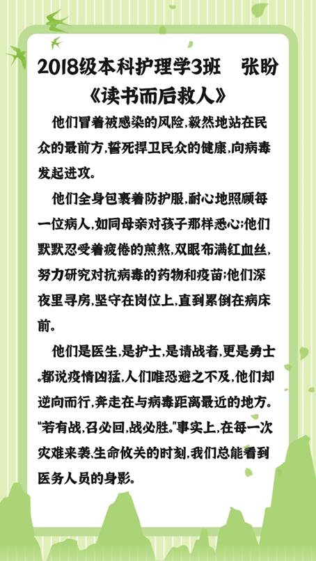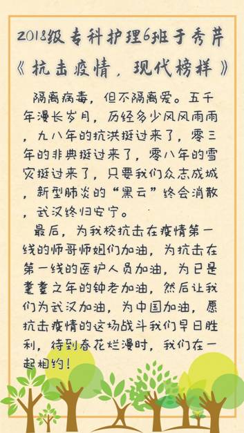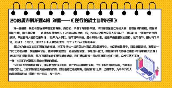 2018级专科护理4班的刘键同学在《逆行的战士自带光环》中表达出了他对于抗疫一线的学长学姐的敬佩与赞美。“你们不是无名英雄!你们是现代学子的骄傲!疫情当前,你们逆行而战,与时间赛跑、同病魔决战,在发热门诊奔波、在“隔离门”里与病毒赛跑,望着病患们无助的眼神,你们年轻的肩上扛着的是他们对于生的希望。