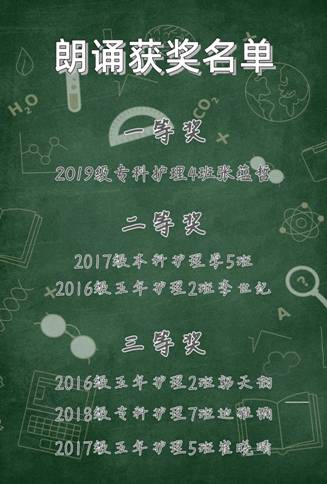 2019级专科护理4班张蕴哲同学荣获朗诵一等奖;2017级本科护理学5班、2016级五年护理2班李世纪荣获二等奖;得者为2016级五年护理2班郭天韵、2018级专科护理7班边雅楠、2017级五年护理5班崔晓晴同学荣获三等奖。