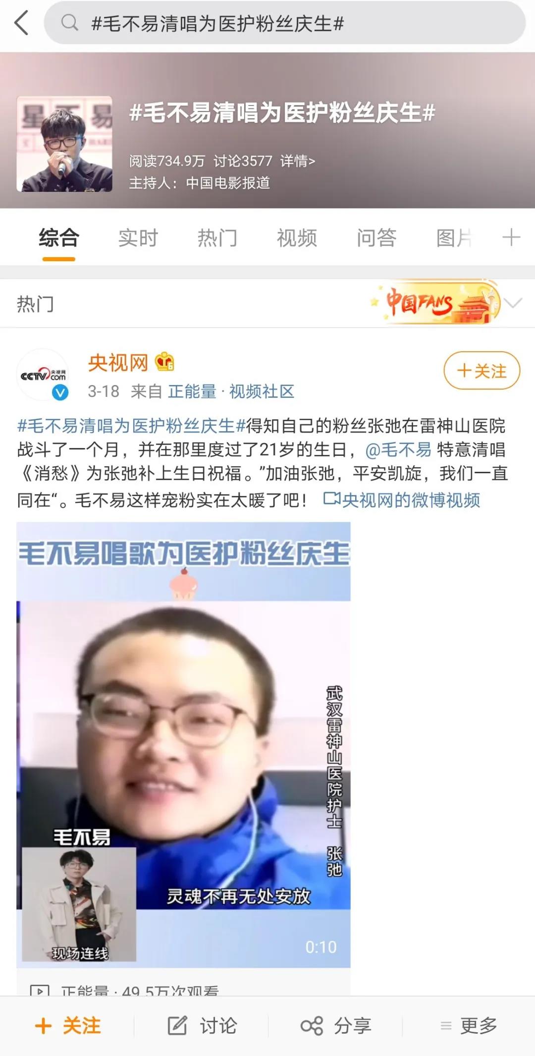 张驰一直是歌手毛不易的忠实粉丝,毛不易在得知自己的铁粉张弛在雷神山医院战斗了一个月,并在那里度过21岁的生日时,特意与张驰连线,为他清唱一首《消愁》并送上生日祝福。”加油张弛,平安凯旋,我们一直同在“。张驰从来没想过自己能够这样近距离接触偶像,也没想过能收到这样有意义的生日礼物。其实只要在我们一直在努力的路上,途中总会遇到一个又一个的惊喜。想必21岁生日礼物带来的不仅是毛不易的祝福,更多的还是张弛在抗疫一线真正的成长。