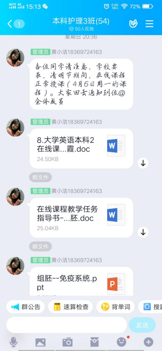 面对新冠肺炎的影响,上网课进行线上学习已经成为了护理学院每位同学的日常生活。然而在学生上课的背后,更有着为同学们而忙碌的还有任课教师与辅导员。为确保学生在家真正做到能够有效学习,把知识点融会贯通,授课教师化身“学习客服”从早上8点到晚上8点长时间不间断在线答疑,帮助同学们攻克每一个学习难题。辅导员老师更是每天督促同学按时学习,查出勤,查作业,确保同学们的身体健康。