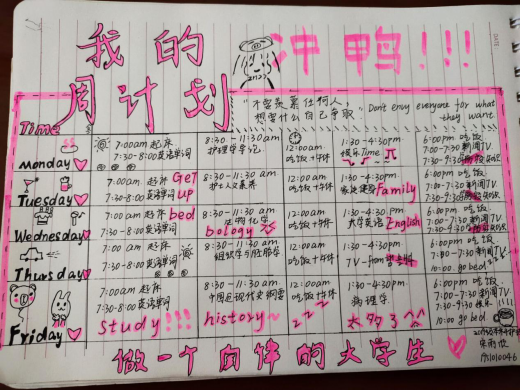 同时在家期间,同学们继续坚持在校培养的自律好习惯,制定网课学习生活计划表。按时上网课、锻炼身体、家庭大扫除、观看新闻了解最新疫情防控情况、陪伴家人,在这个不能出门的假期,护理学院学子的日常仍多姿多彩,全方面发展。