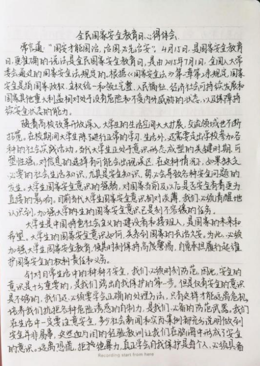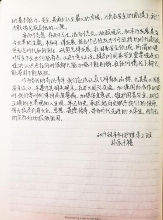 国家安全不仅关乎国家的兴亡,还关乎每一位公民的切身利益。维护国家安全,是为了维护最广大人民的根本利益;维护国家安全,要发挥每个公民的力量!今年全民国家安全教育日的活动主题是“坚持总体国家安全观,统筹传统安全和非传统安全,为决胜全面建成小康社会提供坚强保障”。本次活动一经发起后,护理学院师生纷纷积极响应,观看视频并书写感悟。
