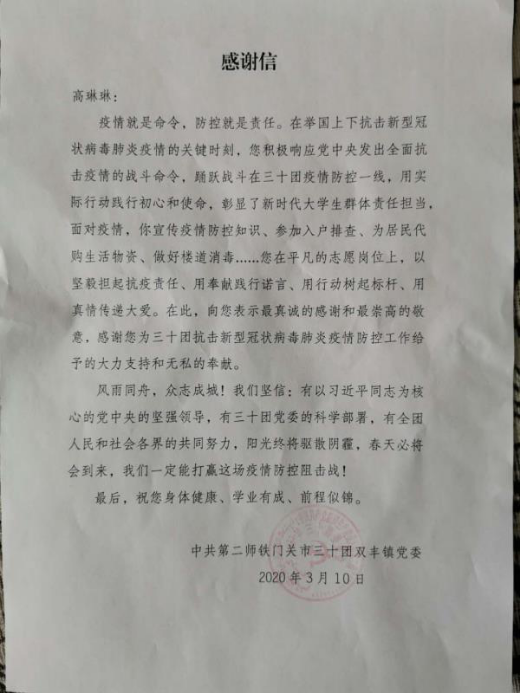 面对疫情,她宣传疫情防控知识,参加入户排查、为居民代购 生活物资、做好楼道消毒……2017级本科护理学2班的高琳琳同学的假期比起其他同学来得更加充实,她积极响应党中央发出的全面抗击疫情的战斗命令,踊跃战斗在疫情防控一线,用实际行动践行初心和使命,彰显了新时代大学生群体素质责任担当。