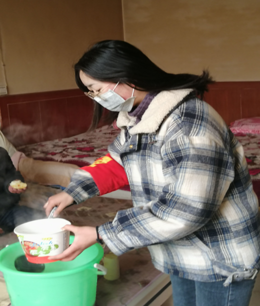 李守莲是护理学院2017级本科护理学5班的一名学生。寒假疫情工作刚刚开展时,她就第一时间联系村长,报名参与义务防疫工作。自从2020年2月份起,她被安排在鲍家寨村口值班。每天早上和留点防守的党员干部同志一起搭建防疫工作点,登记村民来返情况,为来访村民测量体温,发放口罩,消毒液等防疫物资。中午时她前往村委会,给防疫工作点的同志们配送午饭。李守莲说,在防疫前线,共产党员们个个身先士卒,舍小家为大家的奉献精神激励着她向他们看齐。因为经历过,所以更要珍惜,她做为一名预备党员,履行着党员义务,为防止疫情扩散尽着自己的力量。