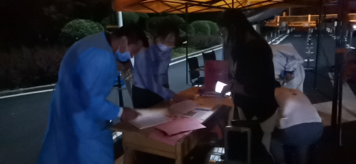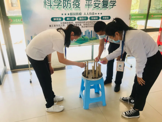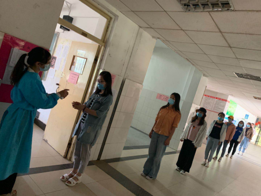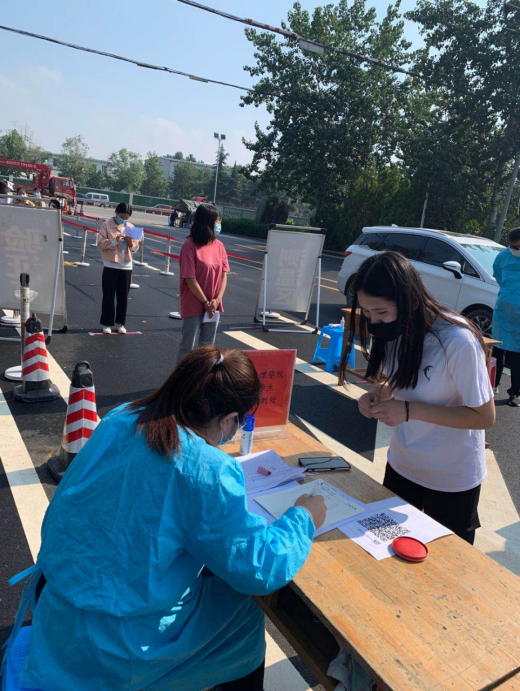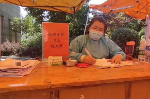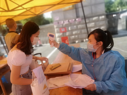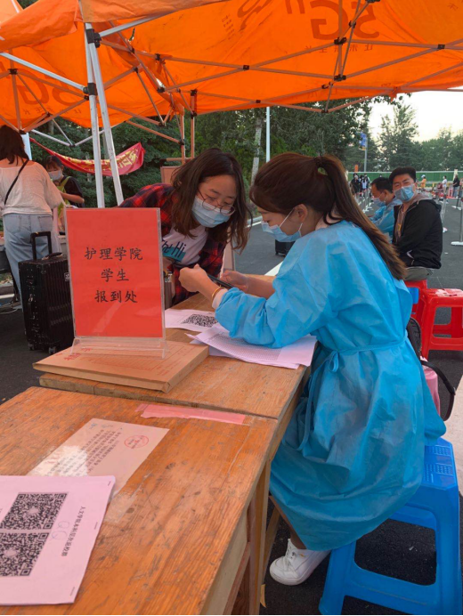 4.在学校门口设置各学院学生报到处,在这里同学们再次出示本人实时绿色健康通行码,由报到处的老师对学生进行体温复测,核验学生身份,同时进行手部消毒