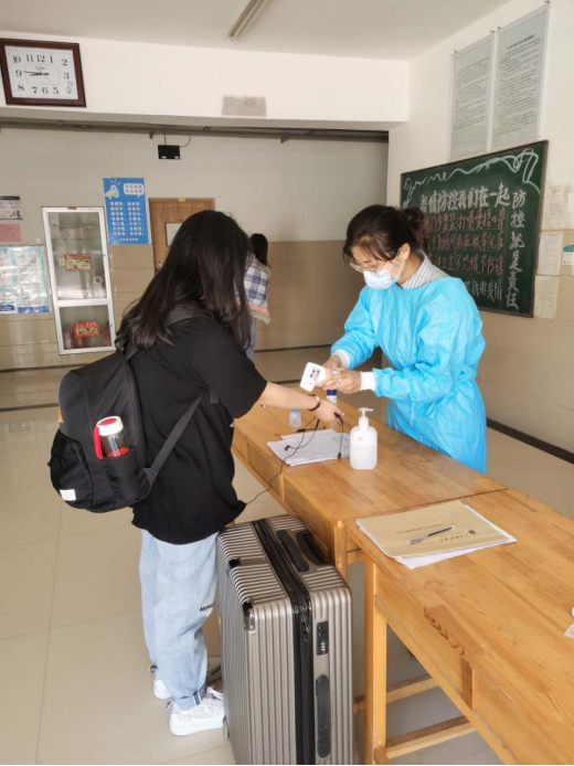 3.由工作人员进行体温测量,学生体温正常,工作人员在学生行李箱上贴上我院专用 “行李已消毒”字样的标签,学生扫描进入校园二维码进行登记