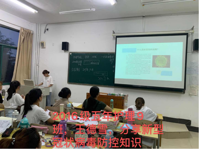 2019新型冠状病毒,2020年1月12日,世界卫生组织正式将其命名为2019-nCoV。在分享新型冠状病毒防控知识时,2016级五年护理9年的王德雪说“身躯的瘦弱,挡不住他们内心的坚韧。和死神抢人,他们与时间赛跑,即使累倒在地,医护人员仍坚持在防疫第一线,这种无私奉献的精神值得我们每个护生学习。”她真心的对医护工作者们说一声“谢谢,你们辛苦了”。