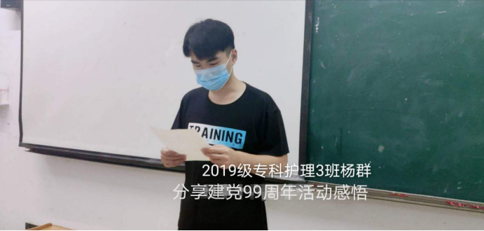 当党歌的旋律响起时,当历史的画面再次闪现,不知不觉中,中国共产党已经走过了99年的历程。2019级专科护理3班杨群同学在建党99周年之际表示,革命永远都在进行时,同学们要永远铭记党的历史,永久保持建党时中国共产党人的奋斗精神,保持对人民的赤子之心。不忘初心,方得始终,记得来处,才有归处。