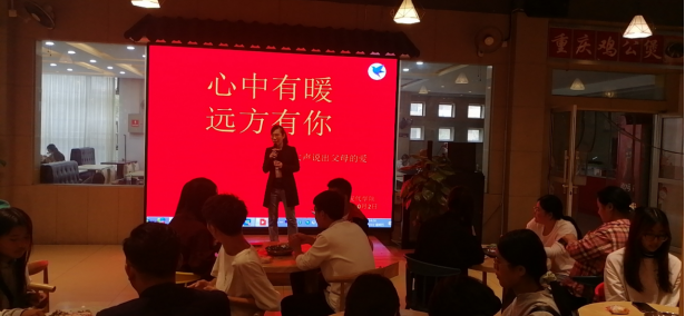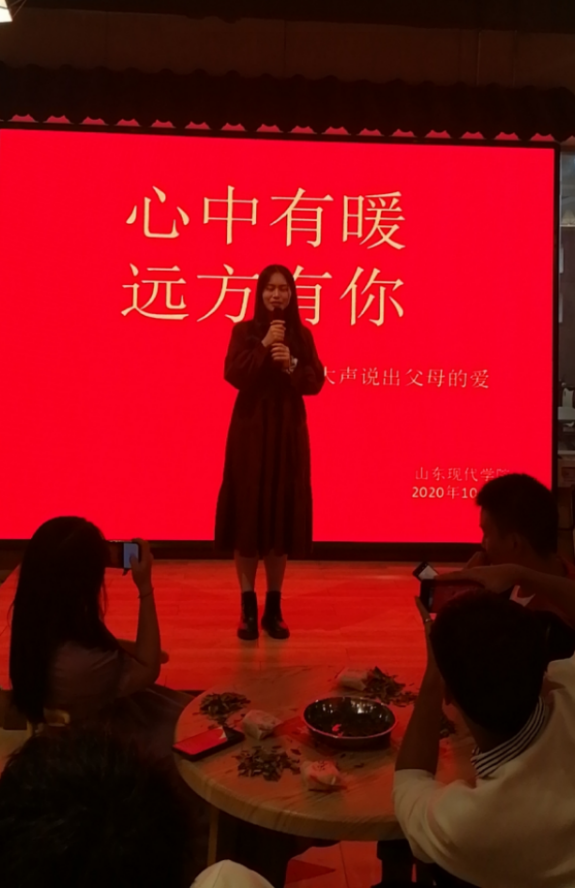 活动继续进行,现场气氛温馨感人,同学们纷纷说出了自己入校后的感受和对家人的思念。“跟随着接待处的学姐进入学校,拎着大包小包的东西,开始了有点迷茫的大学生活,随着到来的军训以及分班上课,让我对学校有了更多的认识,传统文化底蕴深厚,古朴却不死板,我相信自己不会荒废这色彩斑斓的大学生活。”