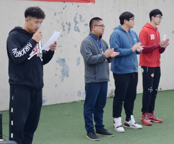 篮球赛开幕式上,篮球队代表电子信息学院程浩轩带领各学院篮球队队员进行赛前宣誓。宣誓完毕,全体参赛队员齐唱国歌,由王忠凯老师宣布比赛正式开始。