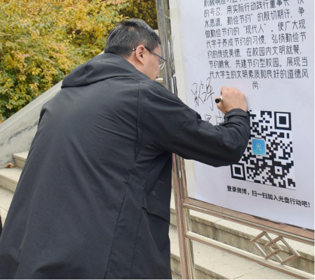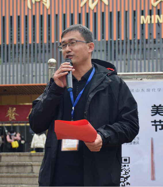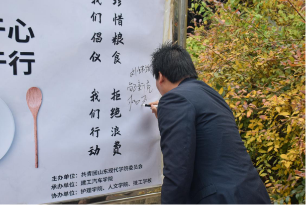 为积极响应习近平总书记制止餐饮浪费的号召,用实际行动践行董事长“饮水思源,勤俭节约”的殷切期许,使广大现代学子养成勤俭节约的好习惯,山东现代学院建工汽车学院、人文学院、技工学校及护理学院于2020年10月27日,在崇检餐厅南侧创业路开展"美德始于心,节俭鉴于行"光盘行动。山东现代学院院长助理吴启军院助,学生处杨冠峰处长、王海员副处长,建工汽车学院房昌盛院长,人文学院刘锦绣院长,技工学校鲍新亮部长,护理学院杨磊主任及各学院学生代表参加本次活动。