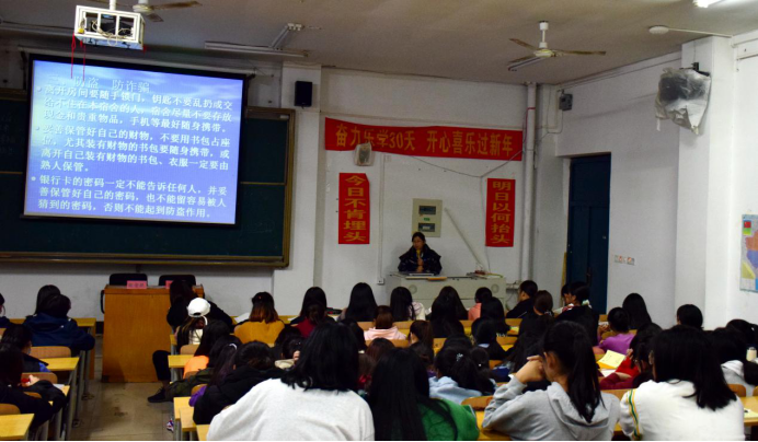 随后,梁老师根据从教多年经验,从思想、人身、财产三个方面系统的给同学们讲解了这样才能保护好自己安全。在思想方面,女同学们要有独立的思想,不要轻易相信别人;在人身安全方面,同学们要有自防自卫的意识,掌握一些基本防身技巧,提高警惕,做好预防保护;在财产安全方面,要注意防盗、防诈骗,提高安全意识,保护好自己的财产安全。同时梁老师提示大家,如果遇到自身发生一些不必要的状况,一定要及时告诉辅导员!