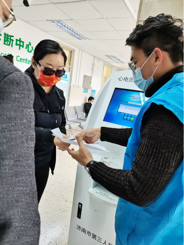在济南市第三人民医院里,除了兢兢业业的白衣天使,还有这样一群可爱的蓝马甲志愿者。他们分工有序在医院人流最集中的门诊区域,他们时刻准备着,他们总是在第一时间为有需要帮助的人提供帮助,他们就是山东现代学院护理学院志愿者小分队。
