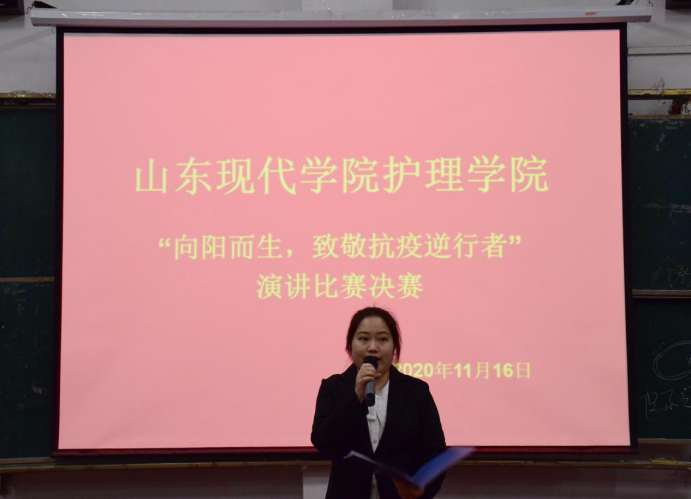 为弘扬爱国主义、英雄主义精神,学习抗疫英雄的先进事迹,展示大学生积极进取的风貌,促进同学们全面发展。山东现代学院护理学院于2020年11月16日在阶梯教室108举行“向阳而生,致敬抗疫逆行者”演讲比赛。