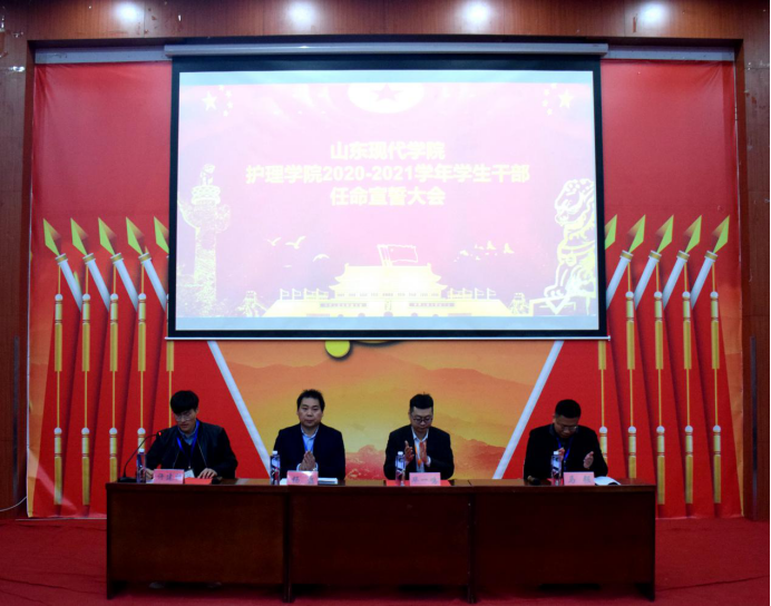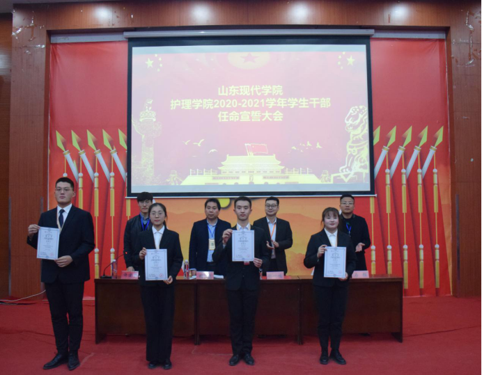 为提高学生会干部自我管理、自我服务、自我教育的意识,进一步规范学生会干部队伍管理,推动我院学生会工作不断向前发展。山东现代学院护理学院于2020年11月10日晚在科研楼101举行了“并肩同行青春追梦,携手共扬时代韶华”2020-2021学年学生干部任命宣誓大会。山东现代学院护理学院办公室主任兼学管就业秘书杨磊,学管就业秘书毕一鸣,学管就业秘书助理马强、许建栋及学生会部分人员参加本次大会。