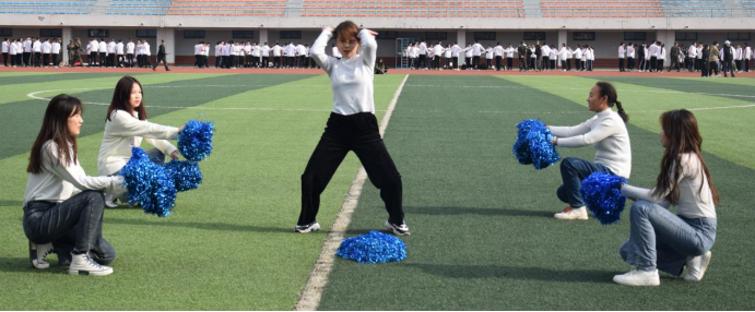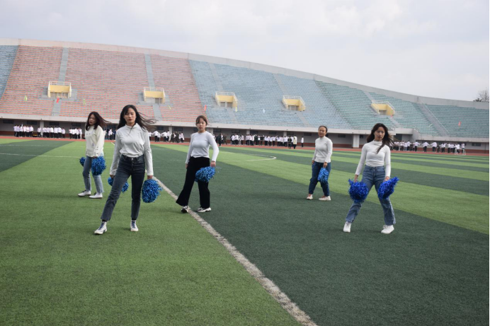 很快,激烈的上半场结束了,医学院队2:0暂时领先,护理学院队也不甘示弱。拉拉队为球员和观众们带来了热情洋溢的加油舞。音乐声中,两队队员暂时休息。