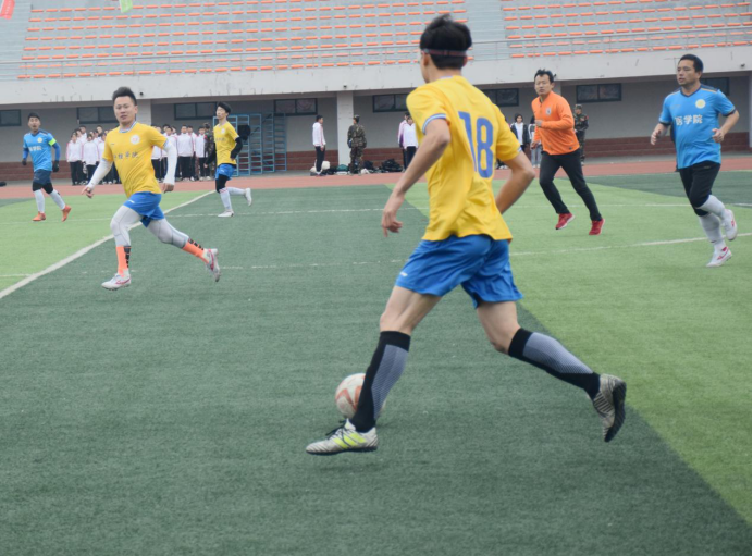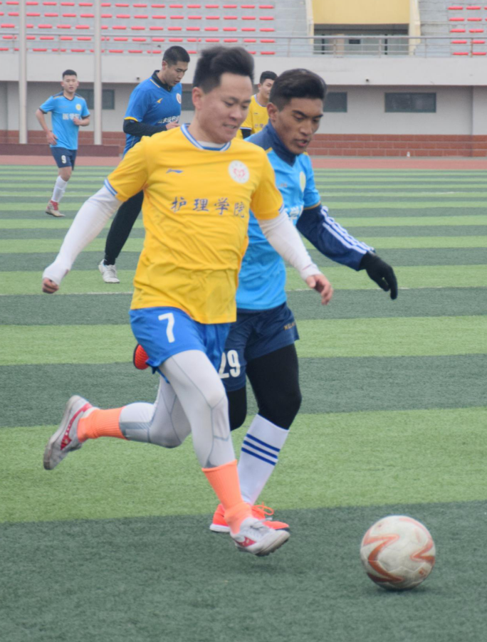 随着主裁判一声哨响,两队开始了比拼。赛场上球员们激烈拼抢,场外观众也不甘示弱,为护理学院队和医学院队加油的声音此起彼伏。时间过半,医学院队连进两球,瞬间点燃了场旁观看助威的同学们的热情。