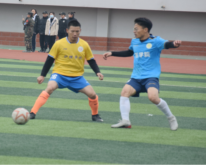 下半场比赛中,两球队换场继续比拼。控球、抢球、假动作……球员们战斗激烈、花样百出。护理学院球员带球,足球在空中划出一道抛物线,准确入门。场上观众欢呼雀跃,尖叫声加油声响彻云霄。在护理学院球员的努力下比分逐渐拉平,比赛进入白热化阶段。