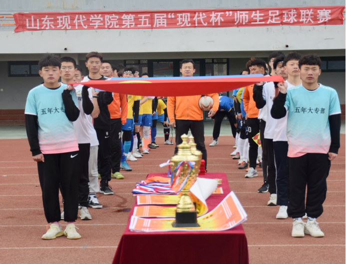 随后,第五届“现代杯”师生足球赛颁奖仪式正式开始。全体成员起立奏唱国歌,然后由主持人宣布获奖队伍,并由领导颁奖。