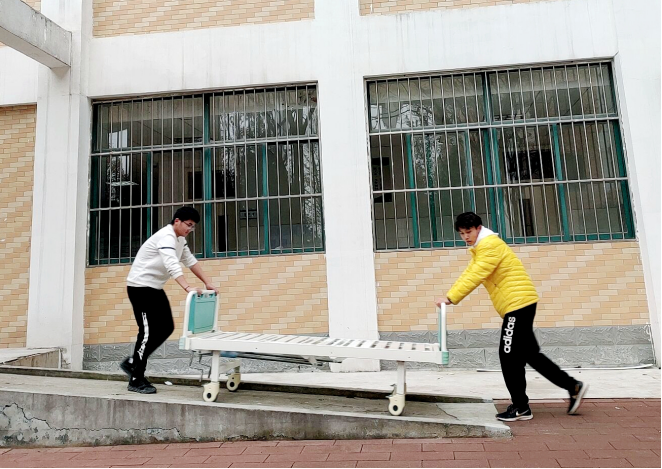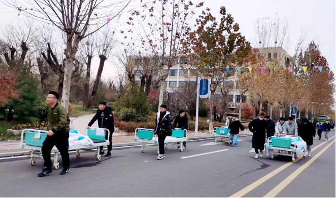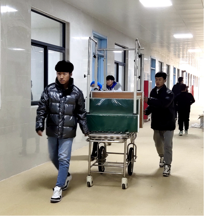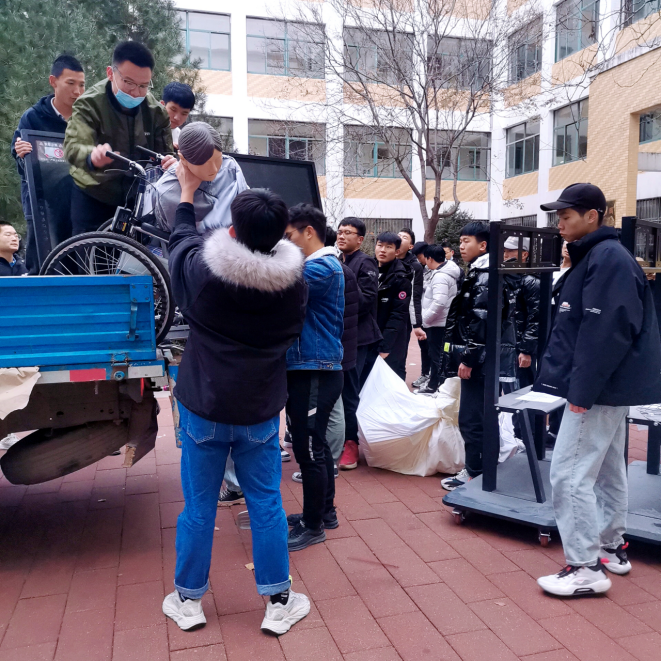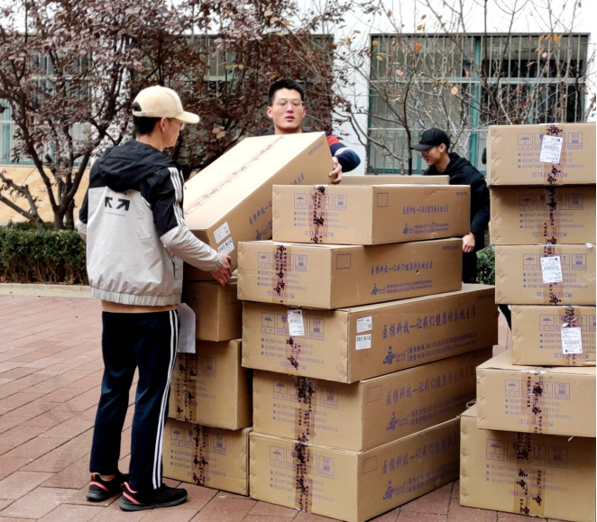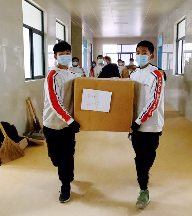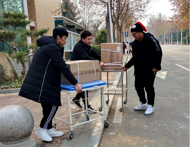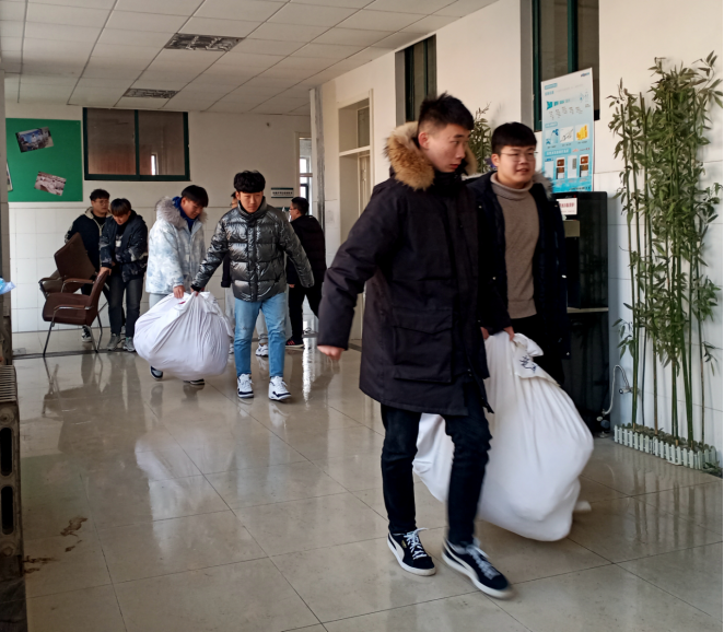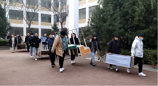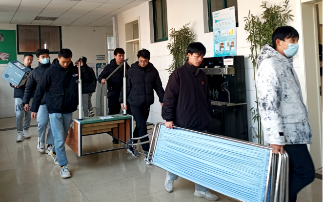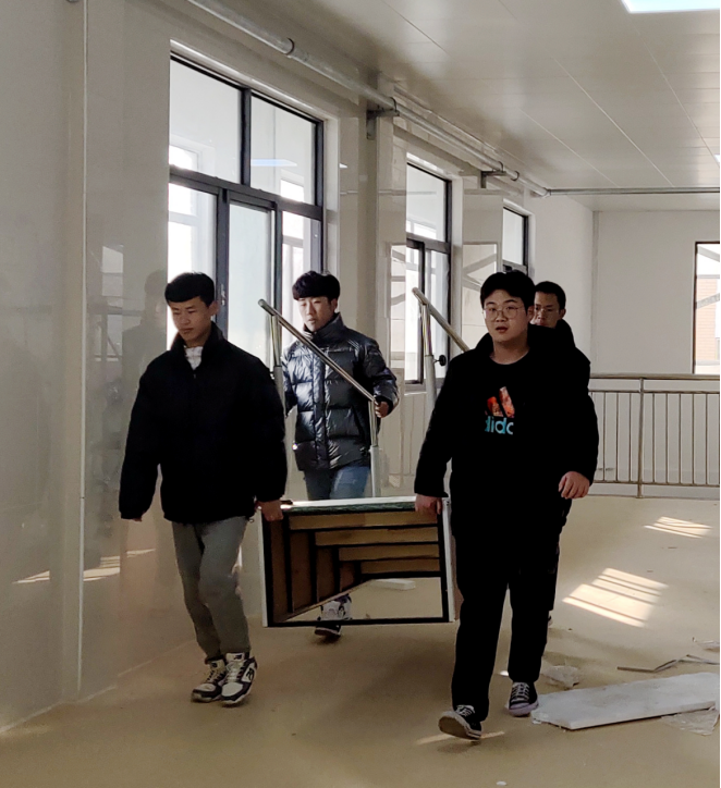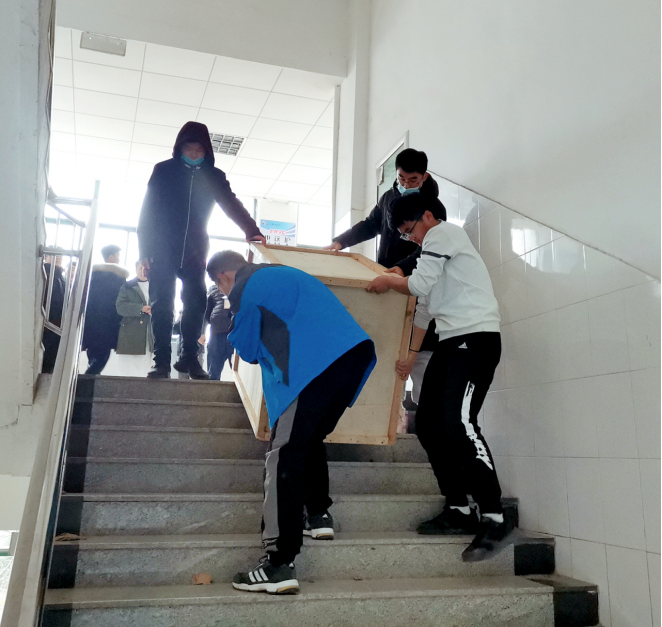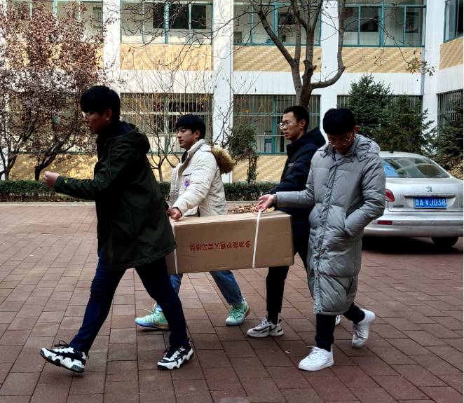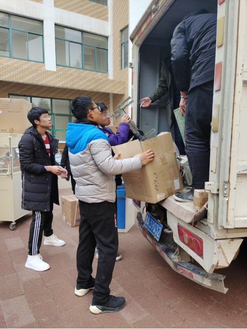 清晨,同学们都准时到达了集合地点。短暂的等待过后,第一批货物入库了。在工作人员的指导下,同学们把实训器材和工具搬运到规定的实训室。