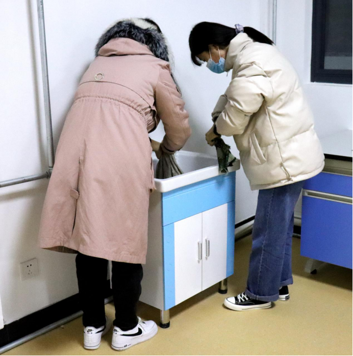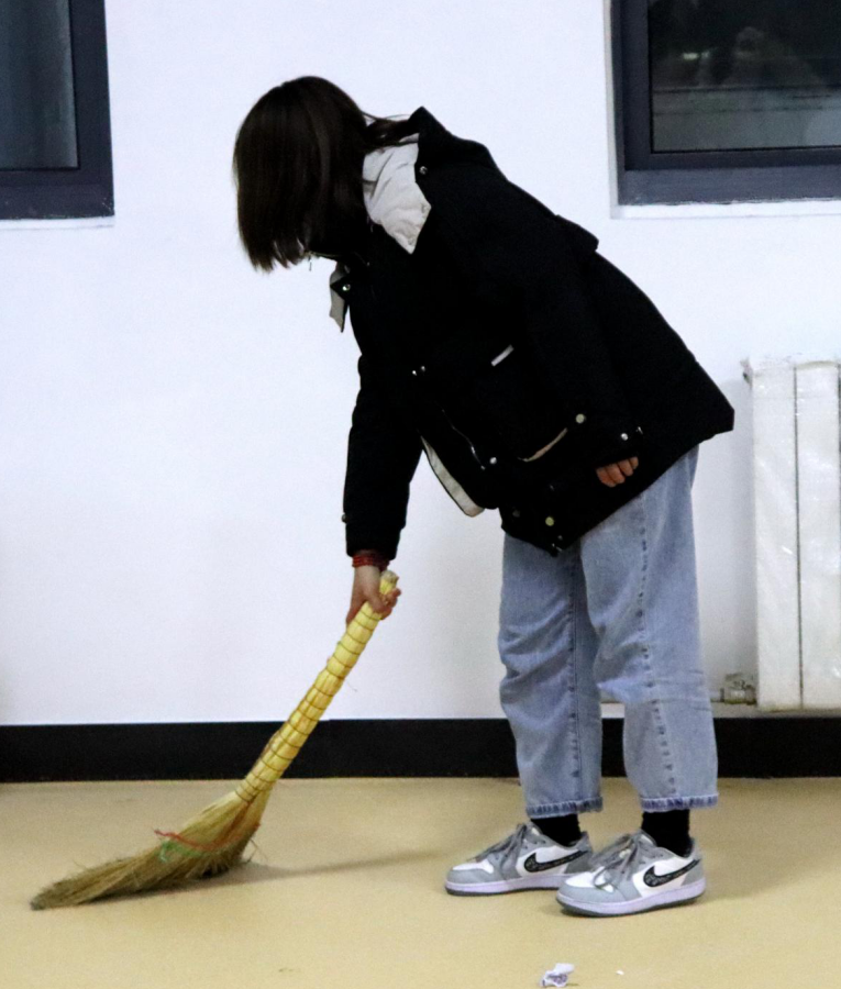 集合完毕后,同学们进入实训楼,老师也参与到清扫之中,清扫工作在老师的指导下井条有序的进行着。