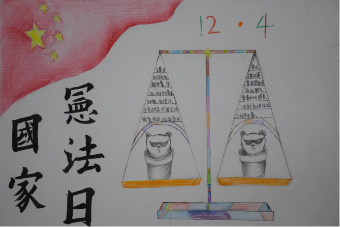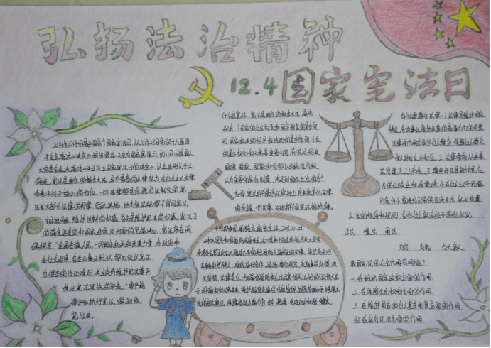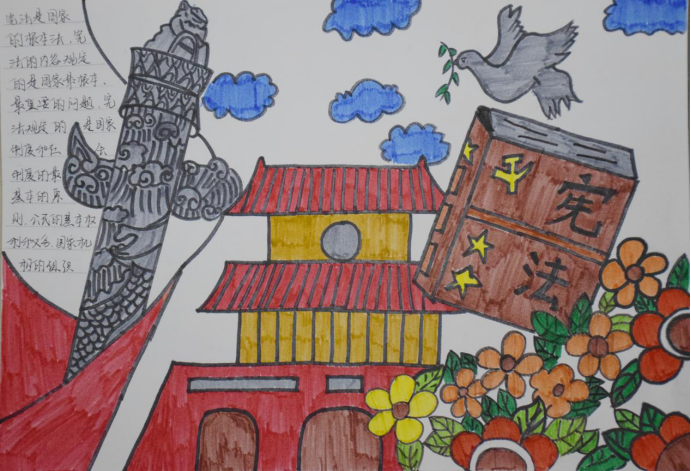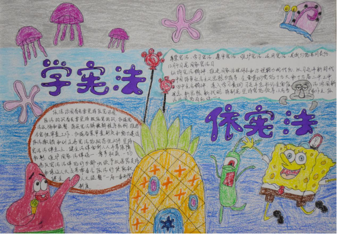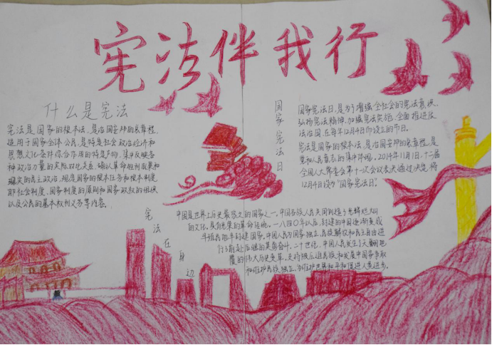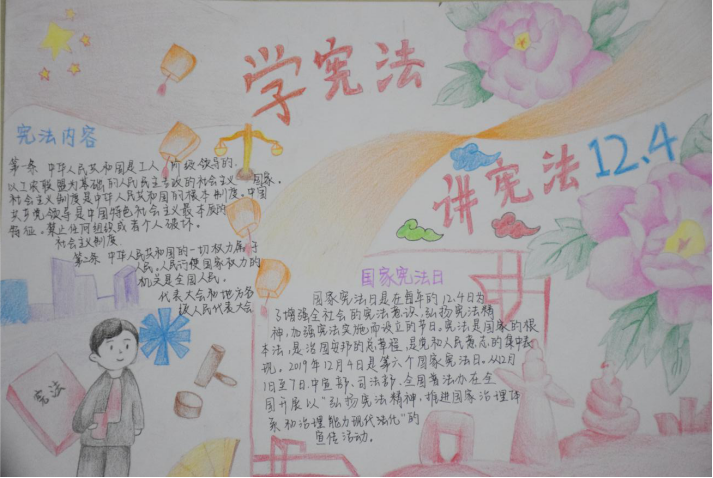当代大学生必须要有牢固的法治观念,深入贯彻党的十九大精神,坚持中国特色社会主义法治道路。通过手抄报的制作,同学们更加了解了宪法的相关知识,做到普及宪法知识,增强同学们的法治观念。