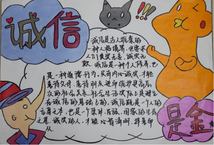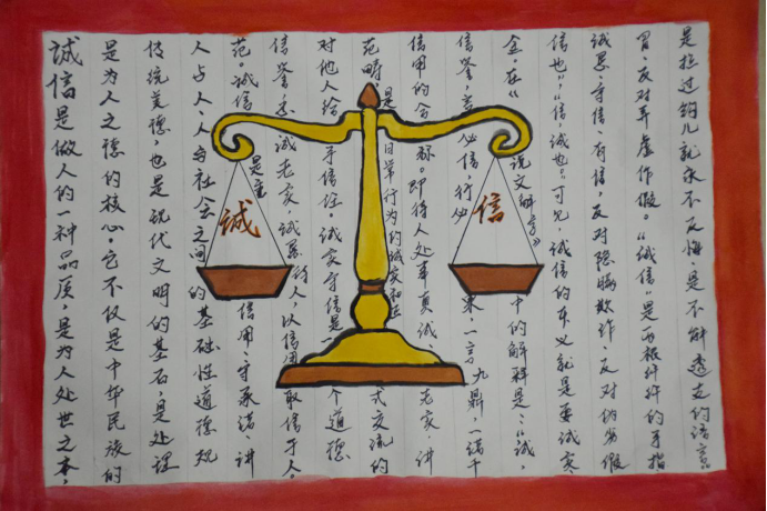 同学们在得知此次活动后,积极踊跃的参加,把自己内心对诚信和宪法的理解转换成手抄报用实际行动表达自己对“说诚信话,办诚信事,做诚信人”的决心,用最简单的方法来表达出对宪法的敬畏。