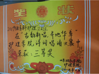 8、多次参加护理学院比赛如诗词唱诵大赛、知识竞赛、朗诵比赛,并在诗词唱诵大赛中获得二等奖;