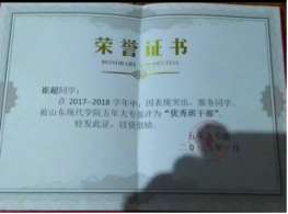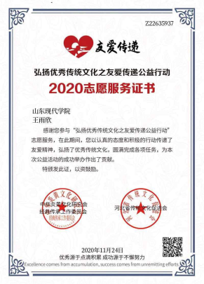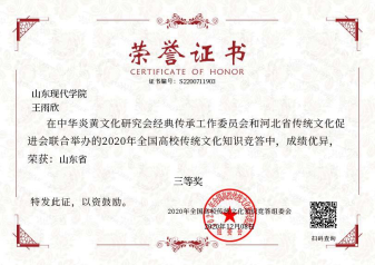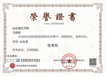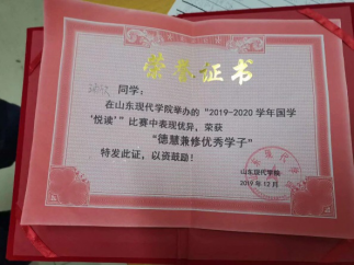 9、参加山东现代学院举办2019-2020学年国学‘悦读’比赛中荣获“德慧兼修优秀学子”光荣称号;