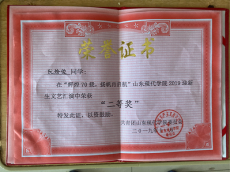 1、参加2019级山东现代学院迎新晚会,获得二等奖;