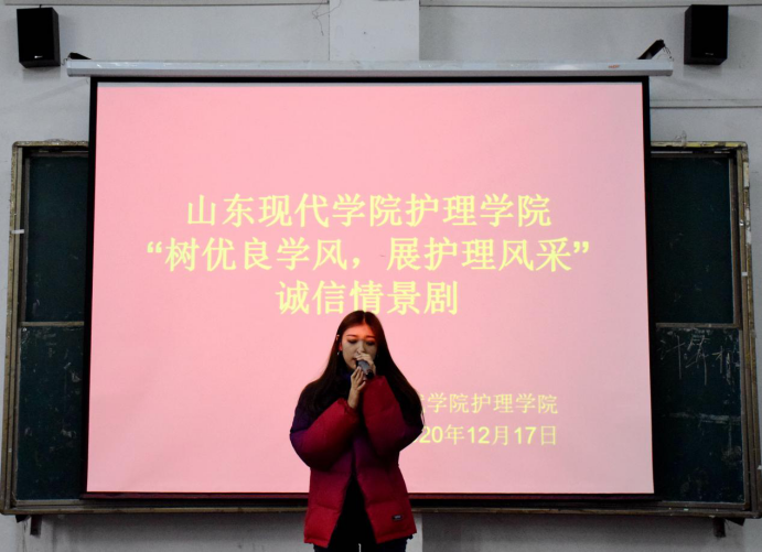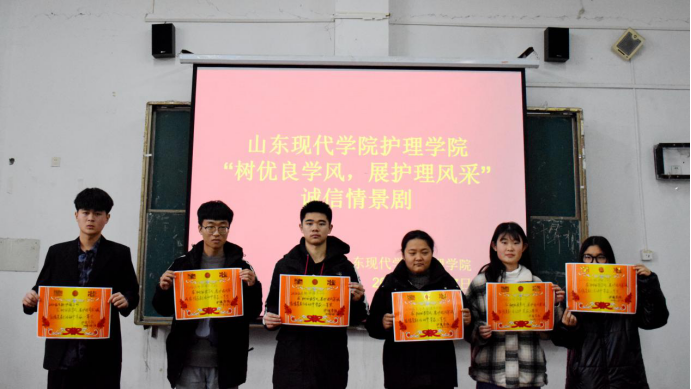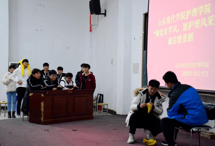 为使同学们认识到诚信的重要性和培养同学们诚信的意识,真正做到诚实守信。加强诚信教育,创建诚信校园。山东现代学院护理学院山东现代学院护理学院特于2020年12月17日在阶梯教室108举行“树优良学风,展护理风采”诚信情景剧比赛。