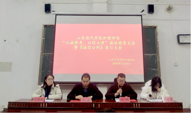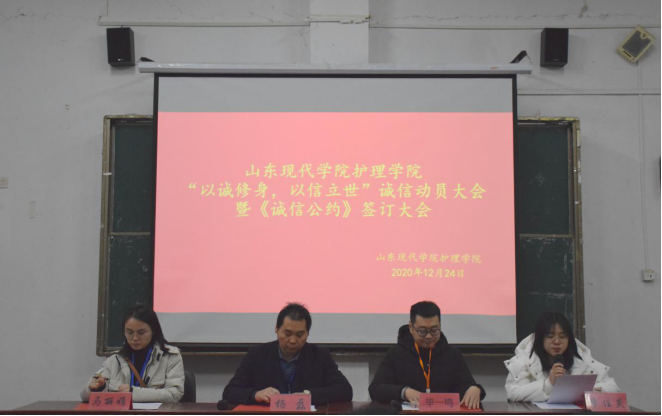 人无信而不立,诚实守信自古以来就是中国人引以为傲的美德。为弘扬诚信精神,营造和谐的校园氛围,山东现代学院护理学院于2020年12月24日在合堂108召开了诚信公约签订大会活动仪式。办公室主任兼学管就业秘书杨磊主任,学管就业秘书毕一鸣老师,辅导员马丽娟老师、李佳炎老师及护理学院部分学生参加本次大会。