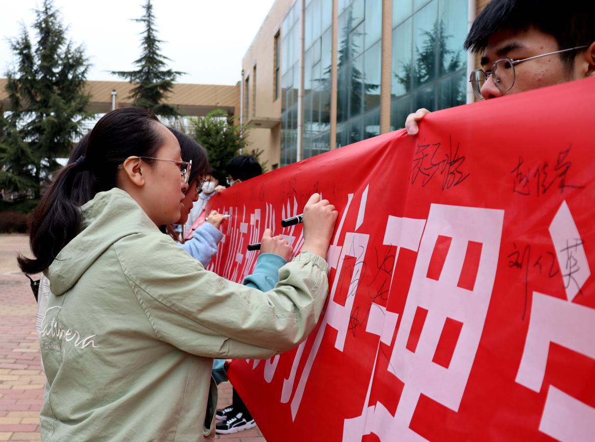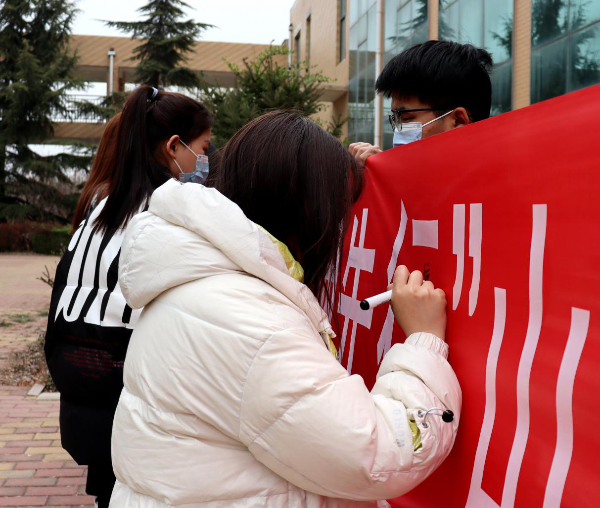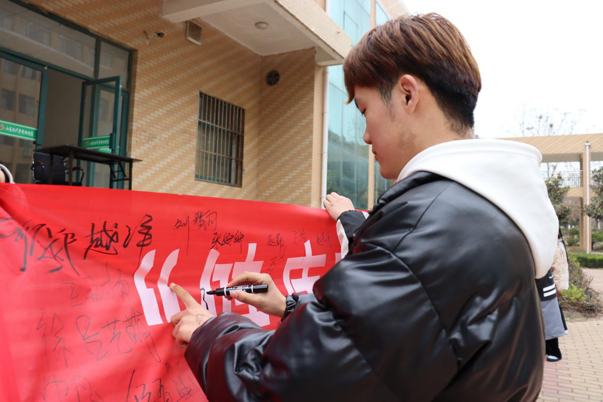最后,同学们依次上前在禁烟横幅上签字。红色的横幅上留下了同学们一个又一个写的端正又下笔有力的签名。同学们纷纷承诺,吸烟有害健康,为减少吸烟带来的危害,大家一定会坚决禁烟,服从学院的安全管理,为创建文明、洁净、优美的校园环境出一份力。